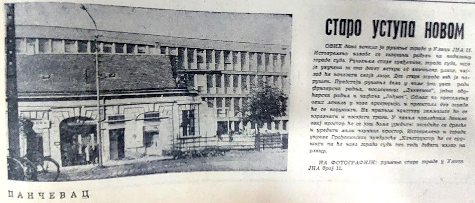 Sredinom šezdesetih ruši se sve što smeta novim zgradama: 1965. pada i prizemljuša u Ulici JNA 11, da ne smeta novoj zgradi suda, uz tekst „Staro ustupa mesto novom“. Uskoro će prekoputa niknuti i robna kuća, zakošena kao i sud – deo planiranog pravca budućeg bulevara ka novom mostu na Tamišu!